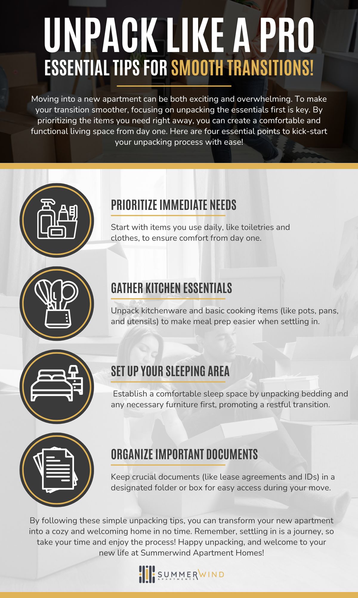 Settling into your new home at Summerwind Apartment Homes can be a breeze with these helpful unpacking tips. If you haven’t yet joined our vibrant community, or if you’re ready to make the move to our beautiful Garner apartments, contact us today to schedule a tour. We’re excited to welcome you home!