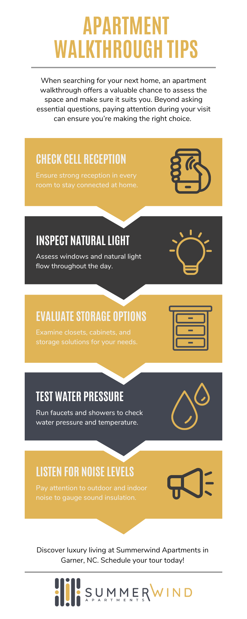 When searching for a new place to live, an apartment walkthrough is an essential step in ensuring that your next home meets your needs. At Summerwind Apartments, we understand how important it is to ask the right questions during your visit to make sure everything aligns with your lifestyle. Located in Garner, North Carolina, our luxury apartments offer a peaceful, wooded setting just minutes from Downtown Raleigh. Here’s a guide on what to ask during your apartment walkthrough to ensure you’re making the right choice.